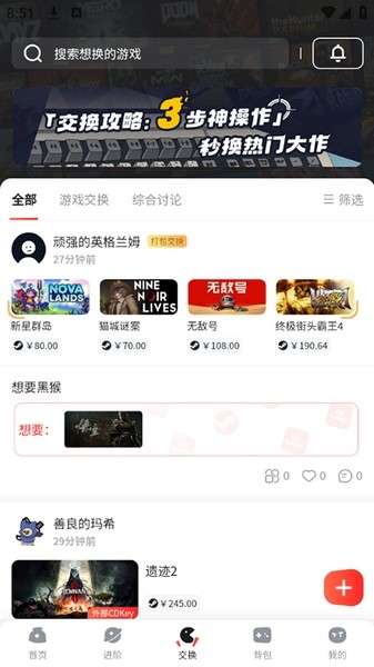 全自由交换社区!可发布需求匹配互换对象,用「文明6」换「老头环」,用「双人成行」换「赛博朋克」,规则由你定义!
