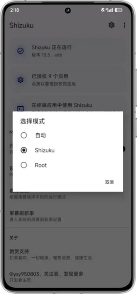 2、首次使用请从桌面图标打开并进行相关授权设置(支持ROOT和Shizuku ,非ROOT设备会自动选择Shizuku模式)。