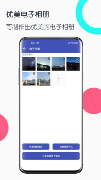 优美电子相册: 支持自由选择相册图片,设置播放速度和样式,让用户制作出满意的电子相册。