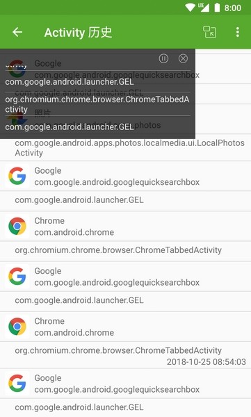 或者叫查看 Activity 历史、栈顶 Activity 信息,可以方便的查看 Activity 包名、类名、打开时间,支持小窗模式显示。