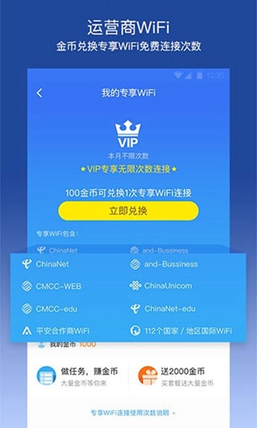 金币可兑换专享WiFi、流量、视频会员、Q币等,福利送不停