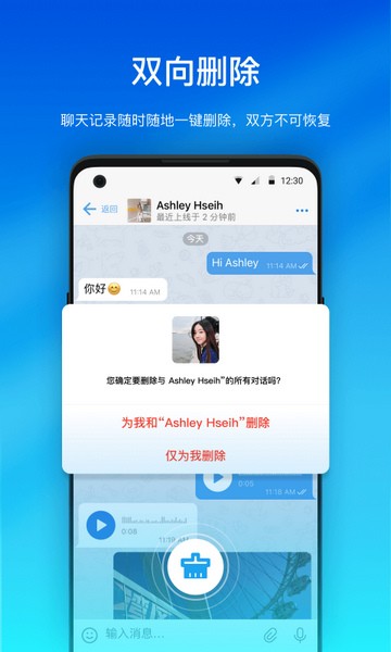 · 双向删除:聊天记录可一键双向删除,对方与您都不可恢复,细致的安全体验;