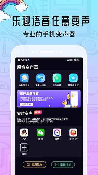 可将语音包共享到微信或QQ,也能够运用悬浮窗进行变声录制,随时随地和小哥哥小姐姐们畅聊!