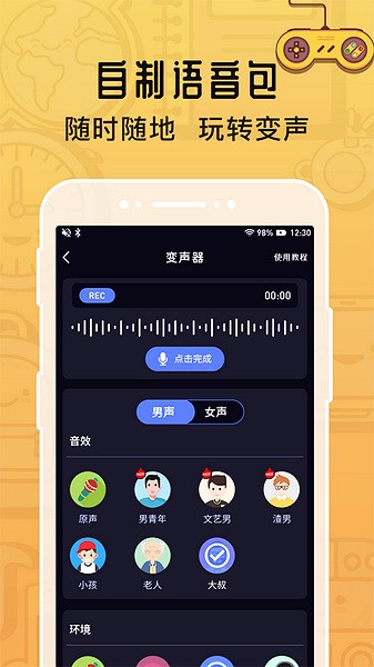 6、多种变声效果可选:爷爷、大叔、小孩、幽灵、机器人,变声时只需轻轻一点,让你成为自带BGM的潮人