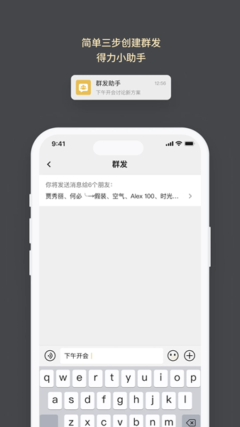 使用群发助手就可以随时创建群发消息,更好的发送信息,快捷发送信息。
