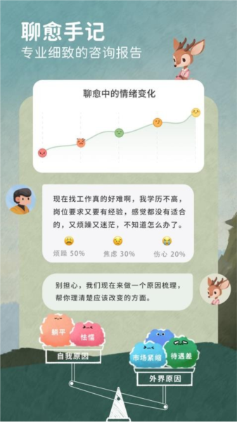 聊天中我们会为你测量情绪占比,并运用多种心理技法帮你分析和整理情绪,给出贴心的建议。