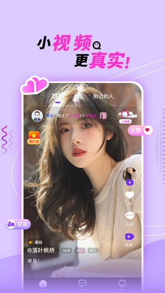 小视频展示真实自我,随时随地在线通话,轻松交流,邂逅心动对象,查看附近好友,一键搭讪,轻松约聊,帮助用户快速告别单身。