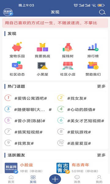 脸盆网,他是来自于《爱情公寓3》中曾小贤谈到的一个社交软件。脸盆网的主要内容是围绕爱情公寓展开,但是这里也是许多热爱爱情公寓的年轻人社交互动的平台,他们可以在一起讨论爱情公寓的剧情,在这里可以找到志同道合的朋友,大家有共同的兴趣爱好,脸盆网是爱情公寓粉丝必备的社交神器。不仅如此,大家也可以在里面分享自己的生活,发表自己的日志,在自己的空间内发布的内容可以公布给大家看,也可以设置成隐私,非常人性化。在脸盆网和天南地北的朋友一起谈天说地,拓宽自己的社交圈,发现者世界的精彩。软件功能
