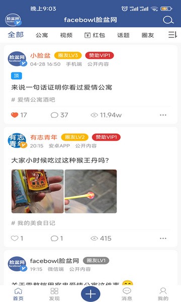 2、全新的底部导航样式和快捷发布按钮。