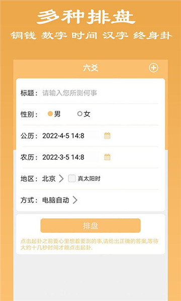 1、打开大师六爻排盘软件后,首先输入测算【标题】,并选择对应的性别、公农历等参数。