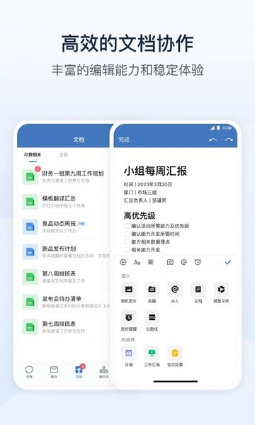 2. 员工可以在文档中插入聊天记录、群聊名片、个人名片