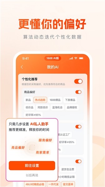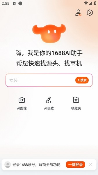 1688AI版是阿里巴巴旗下1688平台推出的一款智能化采购软件,通过这款软件能够帮助用户快速的寻找做自己所需要的产品,并且还会主动推荐对应的商品,同时预测了实时价格波动,避免了库存风险。同时该软件中还内置了ai工具,用户只需要上传图片即可进行检索,满足用户的各种需求,有需要的小伙伴快来下载吧。