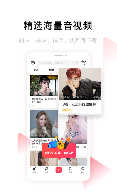 【音乐社区】-全新打造k歌社区,用声音记录你的生活,图文语音让分享更声动,海量歌曲满足你的各种风格,强大的音效、一键修音功能,给你录音棚般K歌享受!