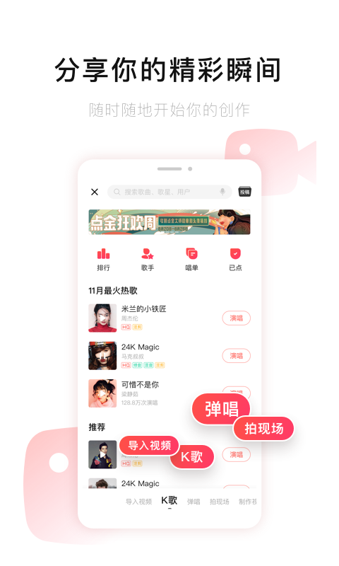 【好友互动:随时随地,亲密无间】 - 缘分开始于每一次有爱的互动,用礼物和评论表达爱意 - 做为一名忠实粉丝,超多实力歌手和作品,等你pick上榜 - 好友间K歌打擂,谁是麦霸,用实力说话 - 加入K歌群组,和志同道合的小伙伴一起愉快玩耍。