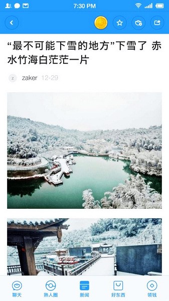1、在UI设计上,聊天宝App延续了子弹短信的风格,不过底部菜单栏变为“聊天”“新闻”“好东西”“领钱”四个TAG。前两者分别为子弹短信原有的社交功能和资讯消费,后面两个则是此次新增的玩法。