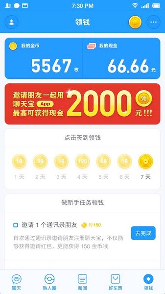 2、聊天宝的“领钱”栏目与趣头条非常类似,用户可以通过签到、“阅读新闻”人家有事、“发送熟人圈”、“扫码支付”、“点赞、评论”、“与好友聊天”等方式领取金币。