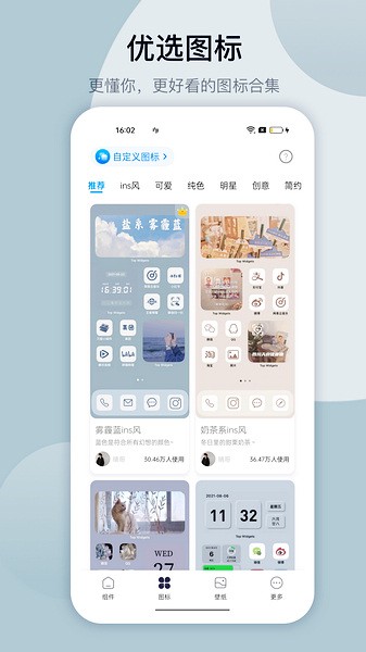 用户可轻松自定义图标,包括可爱、明星、创意、ins风、简约、拟物、纯色等多种类型,满足用户对主题个性化的各种需求。