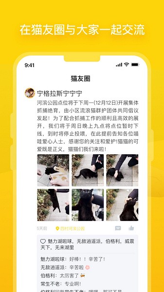 3、在【猫友圈】,可以创作精彩的猫猫抓拍与吃播,报修云监督猫屋安全,参与猫猫救助,真诚夸赞那些正在爱猫的人与事