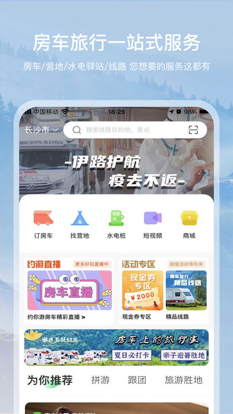 约你游APP是一站式房车旅行社交电商软件,为用户提供超实惠的房车租赁、户外露营地预订、旅游线路预订、水电桩共享、吃喝玩乐团购等一站式房车旅行服务,是房车、户外、自驾及旅游爱好者的内容分享和兴趣交友社区。在这里,你能享受食、住、行、玩、娱、购全方位服务,真正来一场说走就走的房车旅行,还能发现美好、真实、多元的生活,找到有意思的旅游达人,与他们一起记录和分享自己房车旅行生活的点滴。作为一款方便的款房车出行服务提供软件,约你游为用户提供不同种类、规格大小的房车租赁服务,还有超多超全的房车旅游攻略,非常好用。