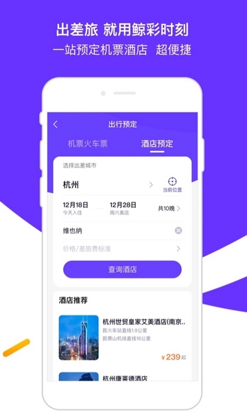 鲸彩时刻是一款专为企业商务人士设计的智能服务软件,主要功能包括酒店、机票预订和行程管理等,操作简单又高效。出差时可以直接用它提前订酒店和机票,还能直连四大酒店集团,比如如家和亚朵,服务很贴心。订完后还会自动记录备忘提醒,再也不用担心错过行程了。