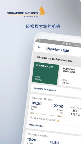 5. 体验未来飞行 连接KrisWorld机上娱乐系统,直接从您的手机/平板电脑上播放影片,查看飞行路线和飞行轨迹。* *此功能在A350和部分Boeing 777-300ER机型上均有提供。 新加坡航空APP由新加坡航空公司开发,您可放心使用。