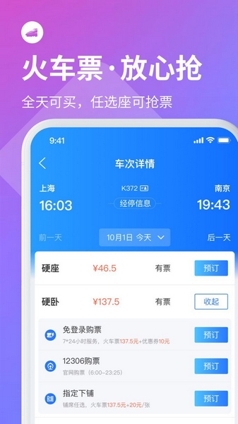 4、全国火车票随意订,出行更无忧,还支持学生票,儿童票,12306直连购票。全新极速云抢票、上车补票,抢票快人一步更省心。