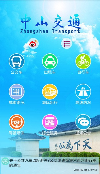 中山交通app是由中山市交通运输局向市民推出的一款中山市本地公交运输信息服务平台,软件内为用户们提供了非常多实用的功能,包含了公交车、出租车、公共自行车、城市路况、城际出行、高速路况、驾驶培训、综合服务和通知公告等,大家可以非常轻松的查询自己要乘坐公交车的路线,为当地的市民们日常出行提供了许多便捷。