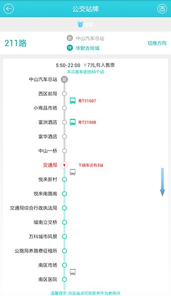 3、功能全面:周边线路地图导航,附近公交距离多远、还有几站到一目了然;在中山交通输入起点和终点,智能筛选出多种换乘方案,提供详细的可行性线路和公交站牌信息。