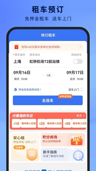 0元免押金,租车低至5折起,超多租车福利尽在铁行租车平台。