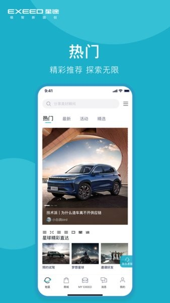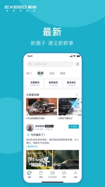 社区:最新最全的的汽车资讯,车主的真实用车故事以及媒体大咖的试驾评价,用户可以在这里参加多样化的社区活动,获得高质量社交体验,创造极智的新生活方式。