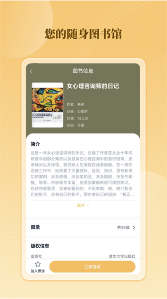 3、自动归还图书的功能不再有线下图书归还的烦恼,系统会自动按借阅期归还图书,省去了许多繁琐的步骤。