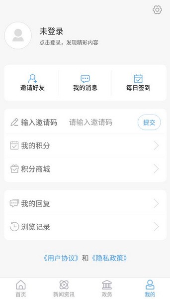 5、我的页面包括登录入口、邀请码填写、邀请好友、浏览记录及系统设置,集中管理个人信息。