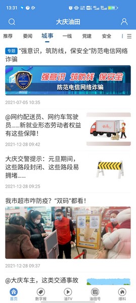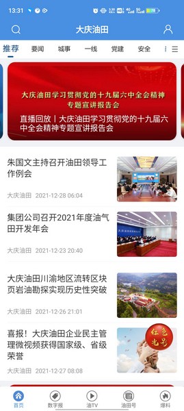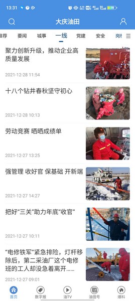 1、进入软件即可轻松便捷的接收大庆油田最新的第一线新闻,默认首页为推荐资讯,但我们也可点击右上角切换