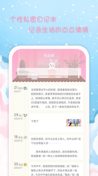 里面还有个性私密的日记本,便于用户可以在线记录自己生活的点点滴滴。
