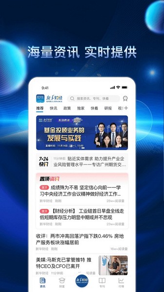 1、在本站下载新华财经软件并打开,进入首页资讯的页面,可以查看每天推荐的资讯、专题、专刊等等权威的财经信息