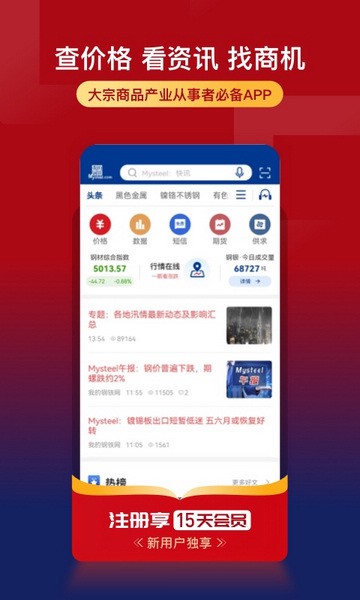 我的钢铁网app是一款专门为钢铁行业从业者打造的资讯平台,软件内包含了钢铁、有色金属、炉料、煤炭、不锈钢、铁矿石等材料的价格行情和资讯,用户们使用这款软件可以找寻最佳的商机,也是了解各路信息的主要来源,大家通过软件充分掌握市场行情,把握钢铁行业最新动态热点,是一款非常适合投资者或从业人员使用的软件,感兴趣的用户快来下载体验吧!