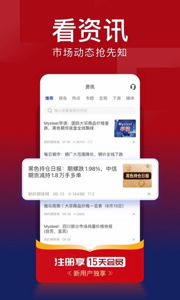 1、【快讯】宏观、行情、库存、钢厂四大快讯栏目,关注行业动态,把握发展向标。