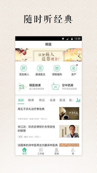 5、进入首页可以点击添加病人、邀请医生、领取福利等,还能查看明医微课和空中药房