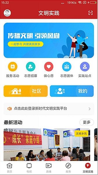 6、同时进入文明实践这里有很多服务活动用户都可以进行参与,还有很多实用功能等着用户自己去发现哦!