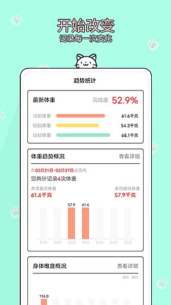 总的来说,体重记app是一个很不错的健康管理工具,适合那些想要科学减肥、健身的朋友。它不仅记录数据,还能通过多维度分析帮助用户更好地了解自己的身体状况。如果你也在为健康问题烦恼,这个app绝对值得一试!