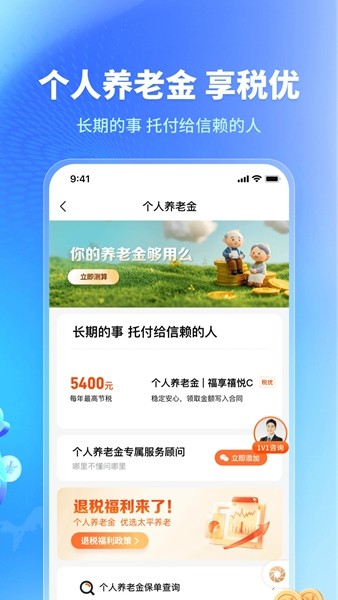 福享太平是一款由太平养老保险股份有限公司推出的保险服务应用,主要为老年人提供便捷的养老保险投资和健康管理服务。软件不仅有丰富的保险产品选择,还贴心地加入了附近药店导航功能,方便老年人在需要时快速找到最近的药店买药。此外,还有AI顾问随时解答用户问题,让养老生活更轻松。