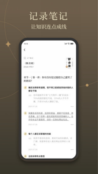 笔记就是帮助建立知识由点到面再到网络的过程,所以我们不仅仅提供「原文稿」中划线和记笔记的功能,也能让你更便捷的在音频上打点记录你的想法。我们也真诚地希望这些能真正地帮助到你。