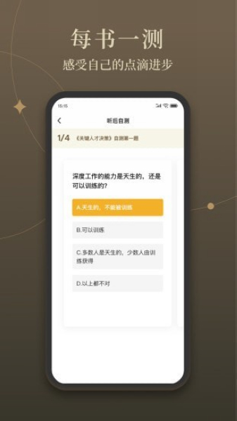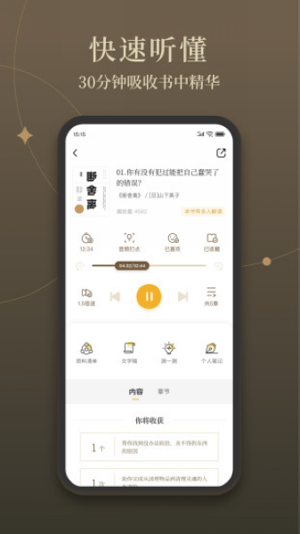 你可以快速选到想听的书;「你将收获」、「内容精华」等栏目是我们总结出来书中的好点、精点、要点;你也可以在「资料清单」中找到我们精心整理的和书相关的资料;「测一测」也可以更好的帮你理解书中的知识;