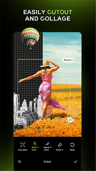在这里我们点击快速抠图操作选项,并选中图中的背景部分,将需要抠图的人像完美的抠出来,最后点击√选项,保存确认即可
