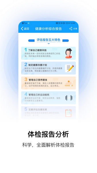 提供手机查询体检报告、化验单、检验单,体检报告解读,在线咨询名医等功能。同时,提供独特的“拍照上传”功能将历年纸质报告识别存储为结构化的电子健康档案。想随时随地了解自己的健康状况吗?还在担心病历报告丢失吗?胖子与瘦子的营养该如何搭配,你想了解吗?好的生活习惯能让你远离疾病,你想知道吗?