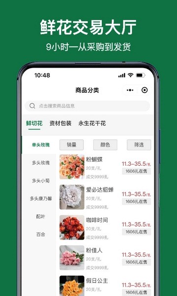 斗南花城app是一款专业又好用的鲜花交易和拍卖平台,囊括了玫瑰、百合以及康乃馨、绣球等多个品类,还有配花专区,轻松满足大家的采购需求。此外,软件中还有一键求购的功能,只需要输入商品信息就能够发布需求,卖家自动找上门来。在斗南花城的鲜花交易大厅中,大家除了可以去自由浏览商品列表之外,也能够搜索商品信息进行选购。
