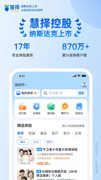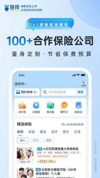 纳斯达克上市(股票代码:HUIZ),累计与全国100+家保险公司合作,累计服务6000万+用户。