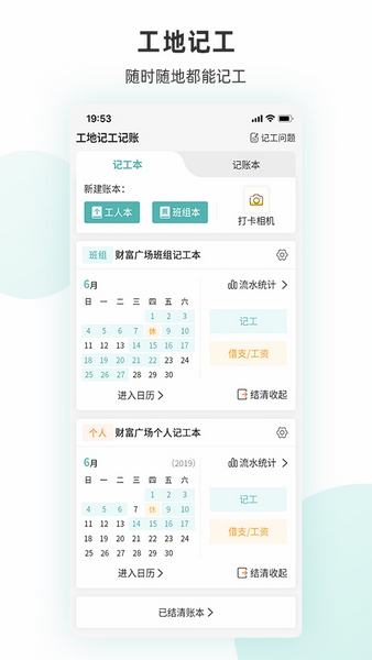 3、工地记工还提供了个人记工本和班组记工本的选择,方便工友们处理建筑工地记工天、记工时、工地记账、建筑工地考勤等。