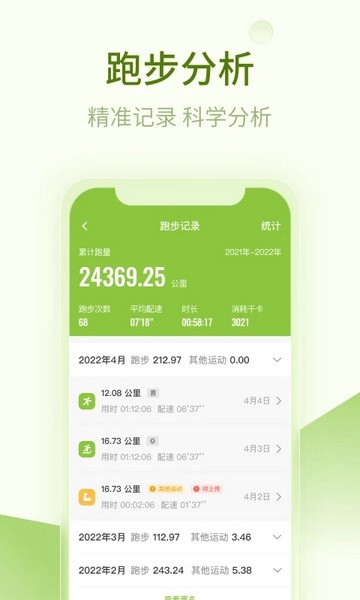 使用第一赛道进行跑步,跑步轨迹、配速、步频、步幅、跑步距离等数据将获得终身保存,并且进行可视化数据统计分析,用户可清楚了解自己的跑步成长情况,并分析自己的身体状况。