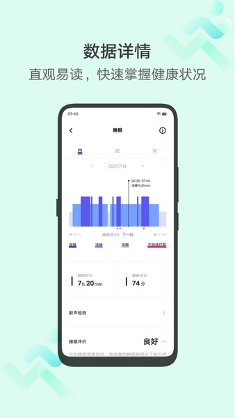 3)记录每天的睡眠情况,深睡、浅睡、快速眼动、清醒时间,并为您的睡眠状态评分。